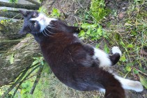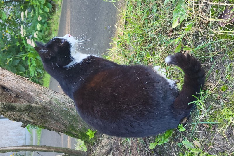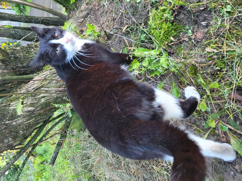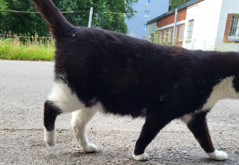 Melnbalts kastrēts runcis, kreisā acs ir traumēta, balts deguntiņš un balts astes galiņš, kreisajai ausij nogriezts galiņš. Draudzīgs un rotaļīgs.
