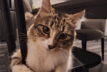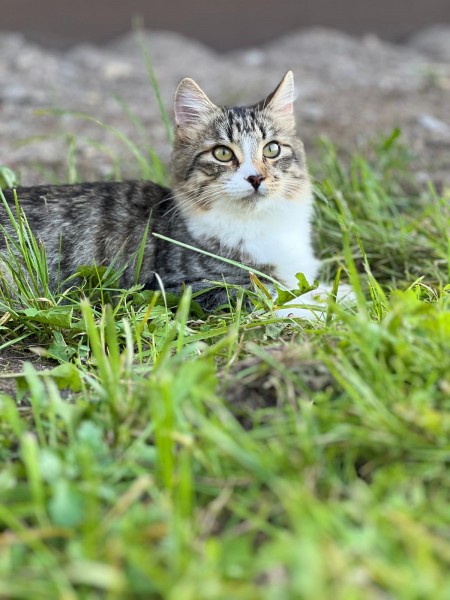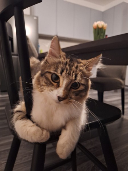 Pelēkmelni raiba ar baltām priekšējām ķepām, baltu krūtiņu, pūkaina, salīdzinoši droša, var ļauties glaudīšnai, viegliņa ap 2kg, čipota.